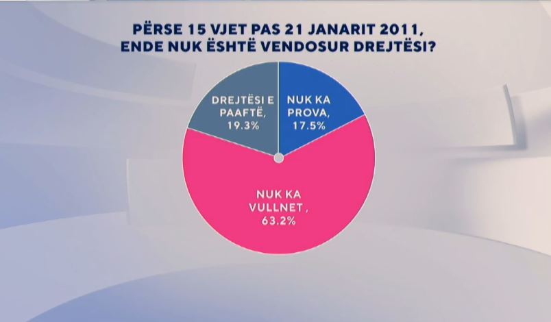 Përse 15 vjet pas 21 janarit 2011, ende nuk është vendosur drejtësi? Ishte pyetje e parë e këtij sondazhi ku ndër të tjera, 19.3% fajësojnë drejtësinë duke e quajtur atë të paaftë. Dhe 17.5 % të tjerë mendojnë se nuk ka prova.