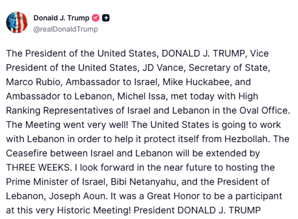 Shtetet e Bashkuara do të punojnë me Libanin për ta ndihmuar atë të mbrohet nga Hezbollahu. Armëpushimi midis Izraelit dhe Libanit do të zgjatet me tre javë”, theksoi presidenti.
