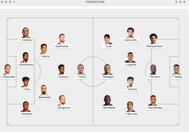 Përsa i përket formacioneve, tekniku Paulo Fonseca i ka rreshtuar të tijët, me formulën 4-2-3-1, ku në portë është vendosur Chevalier. Në krahët e mbrojtjes janë Ismaily e Diakite, me qendrën, që mbulohet nga Alexsandro e Yoro. Më tërhequr në mesfushë janë Andre e Bentaleb, ndërsa Gudmundsso, Gomes e Edon Zhegrova janë vendosura pas “fantazistit” turk, Yusuf Yazici.